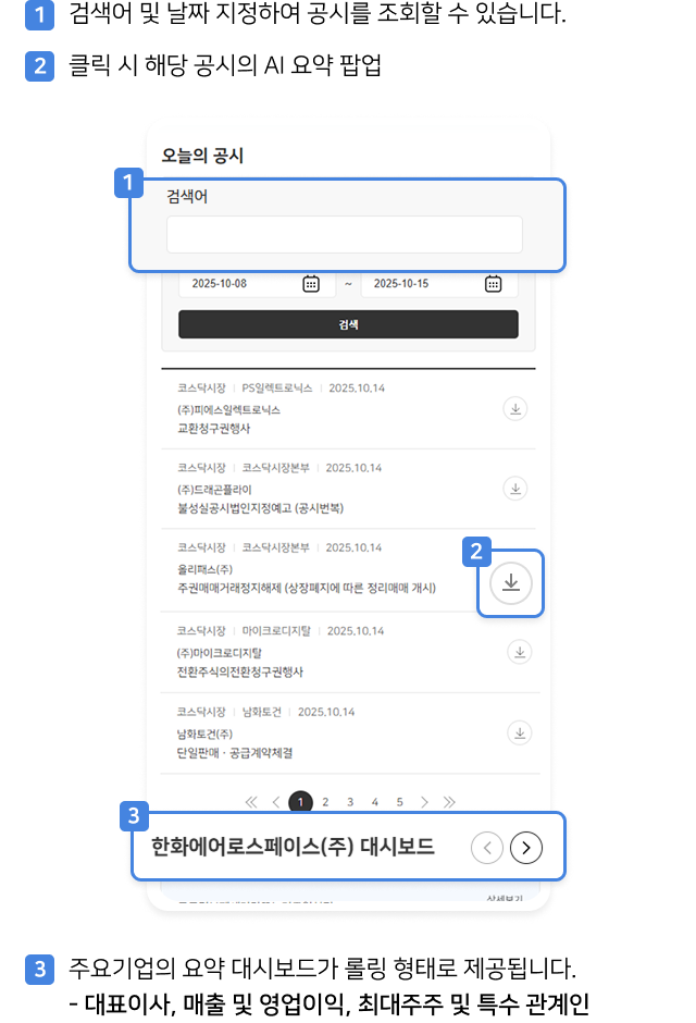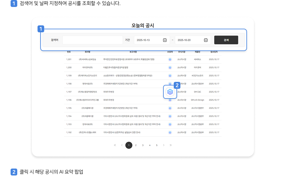 | 번호 | 회사명 | 보고서명 | AI요약 | 주식시장 | 제출인 | 접수일자 |
